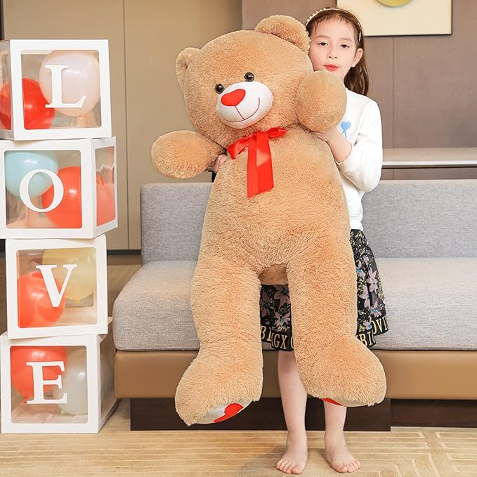 - CUTE DESIGN: The jumbo teddy bear is a realistic plush toy, there are red hearts on the pads and nose, a beautiful satin bow, make it look particularly cute. Suitable for children over 3 years old