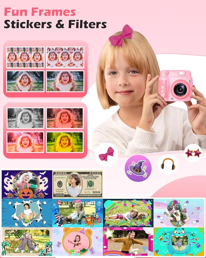 - Multi-Functional & Easy to Use – More than a digital camera for kids! Let children take photos, record videos, play educational games, and enjoy music. With creative filters, fun stickers, and colorful frames, it inspires imagination and artistic expression, making photography and DIY coloring activities fun and easy from an early age