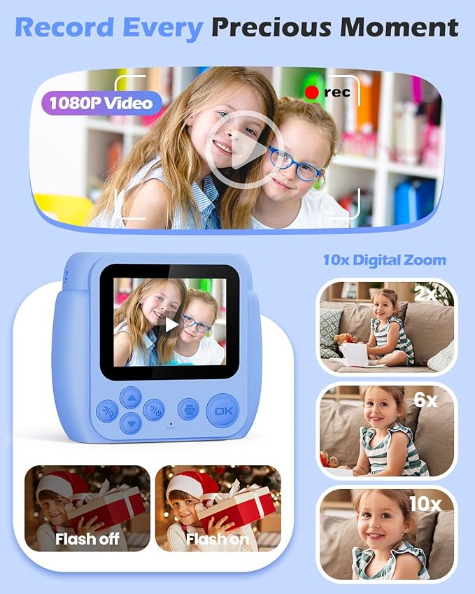 Kids Camera Instant Print - Christmas Birthday Gifts for Girls Boys Age 3-12, 1080P Video Digital Camera with 3 Rolls Printing Paper, Toddler Travel Toy Camera for 4 5 6 7 8 9 10 11 Year Old - Blue