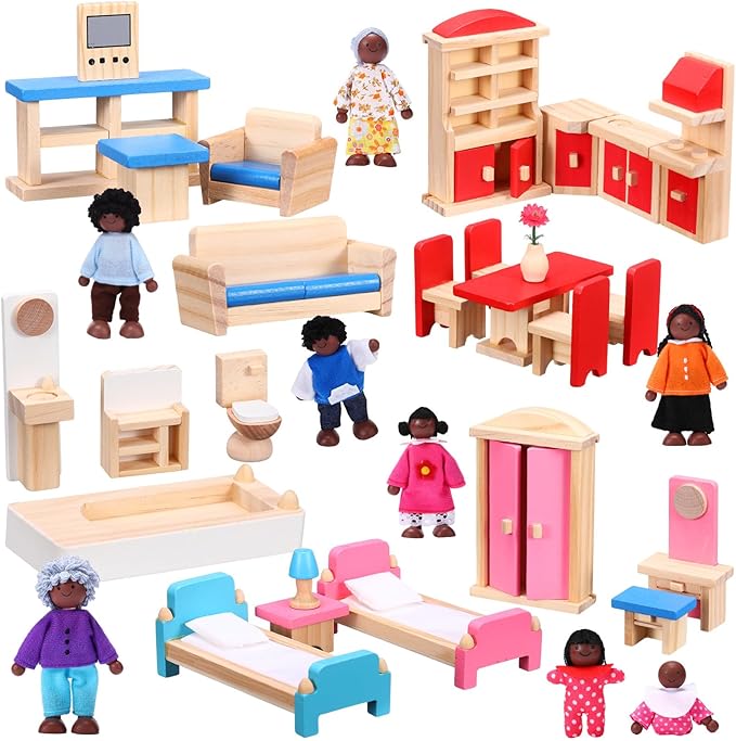 Sumind 35 Pcs Wooden Dollhouse Furniture Set with 8 Family Toys Family Set 27 Pcs Furniture Dollhouse Accessories for Boys Girls, Thanksgiving Christmas Birthday Gift(African-American Dolls)