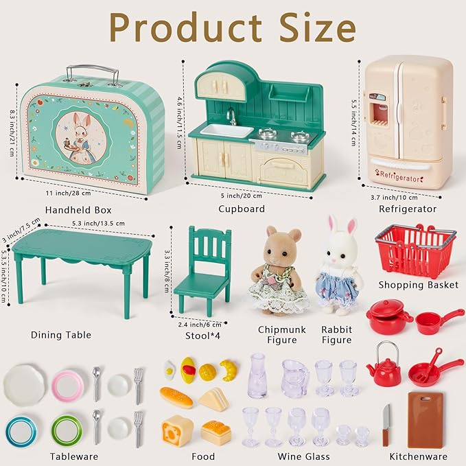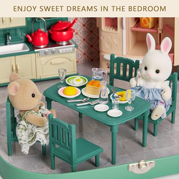 - Portable Dollhouse Kitchen In A Suitcase -Spark Imaginative Play Anywhere:This playset transforms from a compact suitcase into a charming kitchen and dollhouse furniture! you'll find a cozy kitchen Dining table, kitchenware, tableware, refrigerator, bread, 2 dolls with cloth (bunnies & bears). Everything stores neatly inside—just close the lid, grab the handle, and take imaginative fun on the go. Perfect for travel, playdates, or cozy afternoons at home.