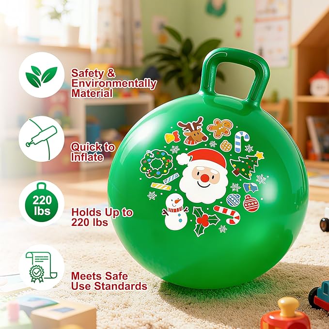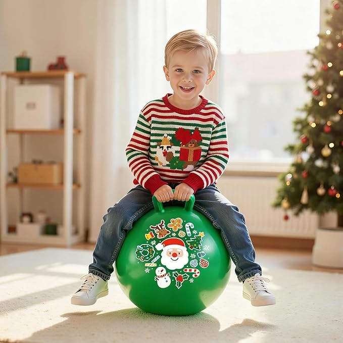 - Jingle & Bounce: Ultimate Christmas Toy Set: Unleash the magic of Christmas with this complete gift set! Kids will love bouncing on our vibrant Classic Festive Green hopper ball, specially sized at 18 inches for ages 3-8.