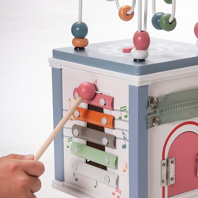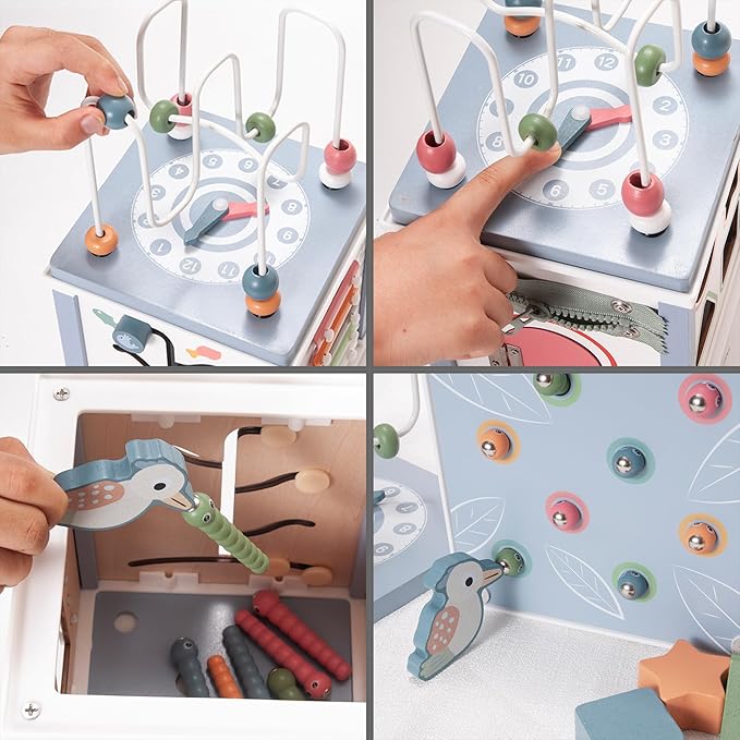 - 【7-in-1 Multifunctional Activity Cube】This wooden activity cube combines seven engaging games in one, including bead maze, clock, xylophone, shape sorter, buckle and zipper, animal track, and bird feeding. Each side offers a unique challenge that helps toddlers stay curious, entertained, and actively learning through hands-on exploration.