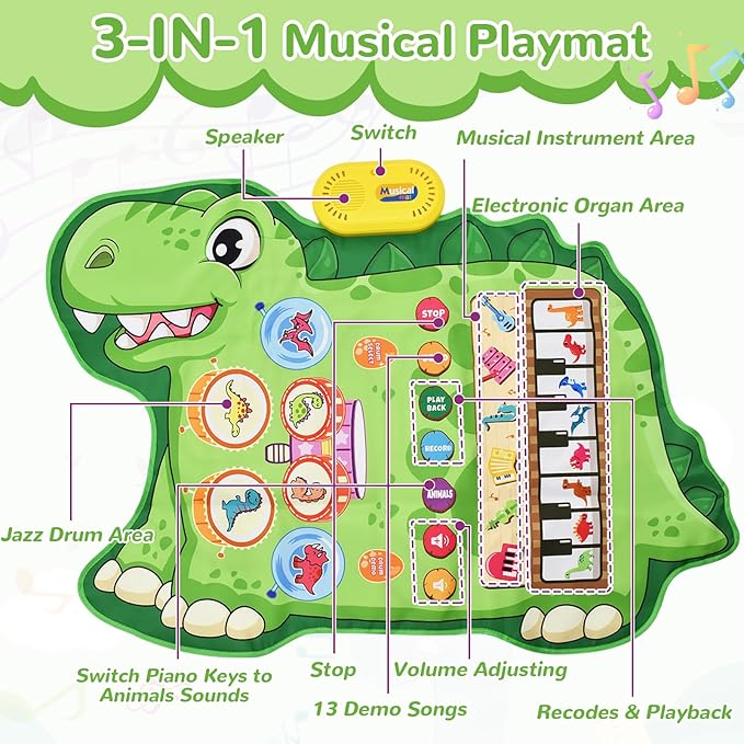 - đ”ă3-in-1 Multifunctional Musical Toysă3 in 1 baby musical mats with drum and piano can help toddlers to learn to play music.The piano side with 6 drum rhythms, 8 piano keys(It can switch between 8 different animal sounds). and 8 kinds of instrument sounds ( piano, violin, accordion, saxophone, Xylophone, guitar, oboe and flute ), Babies will have rich musical cognition.The drum side has 2 sticks for 2 toddlers or twins playing the drum set together.