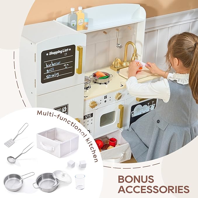 Play Kitchen Set for Kids, Wooden Kids Kitchen Playset with Real Lights & Sounds, Interactive Toy Kitchen with Felt Boxes for Storing Kitchen Utensils and Ice Maker Toy Accessories (Soft White)