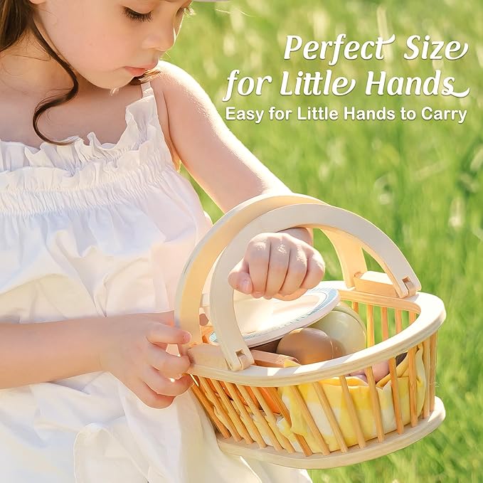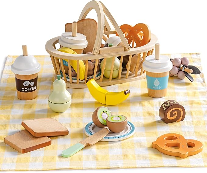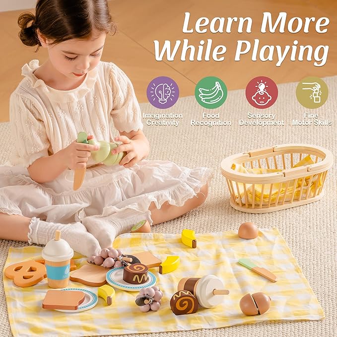 ROBUD Wooden Play Food for Kids, Picnic Cutting Fruit for Toy Kitchen Accessories, Picnic Basket Toy Set with Realistic Play Food, Develop STEM & Make, Montessori Toys for Toddler, WG422