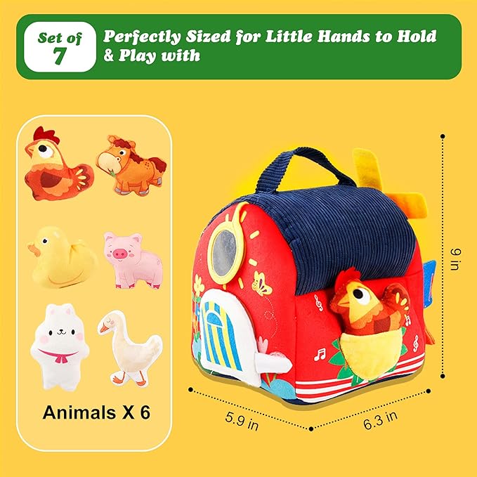 - Montessori Farm Toy for Babies - Single-Opening Barn Design:This developmental toy features a baby-friendly barn with one large opening, perfect for little hands to practice animal retrieval. Helps 6-12 month olds master object permanence through peekaboo play while building hand-eye coordination. Each plush animal offers unique textures and sounds (crinkles, jingles) for sensory exploration.