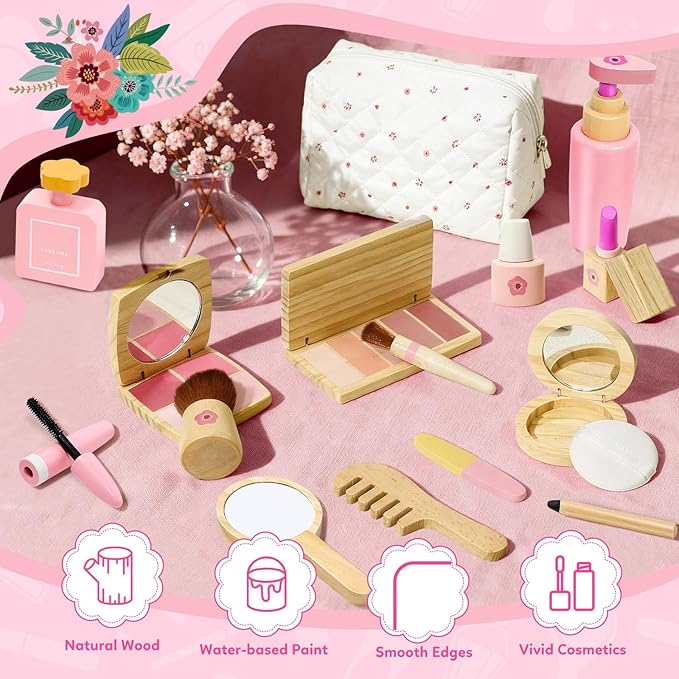 - THE GIFT GETS ALL THE GIGGLES: Birthday? Princess Day? Random Tuesday? This girl's makeup kit is a total showstopper. She’ll play dress-up, throw tea parties, and sparkle at every pretend party. Packed with surprises, this wooden play makeup set is a toddler’s dream bag - with no expiration date