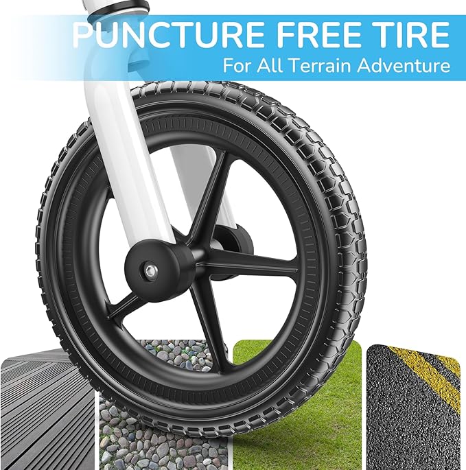 - ALL-TERRAIN TIRES - Featuring puncture-resistant tires, this toddler bicycle is ready for every young explorer. You never need to inflate them, so you avoid worrying about tire blowouts. The anti-slip, shock-absorbing, and wear-resistant tires let children conquer all kinds of terrain on their adventure.