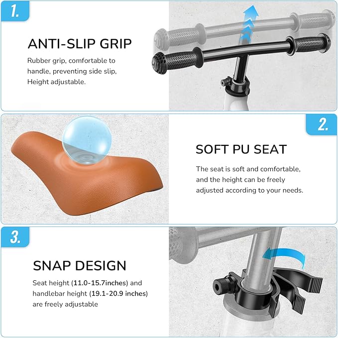 - GROW WITH TODDLERS - Equipped with the quick-release mechanism, the handlebar (19-20.9inch) and seat (11-15.7inch) of this balance bike can be adjusted to the most suitable height as the child grows (1.5-5 yrs). Until age 5, you don't need to buy a new bike.