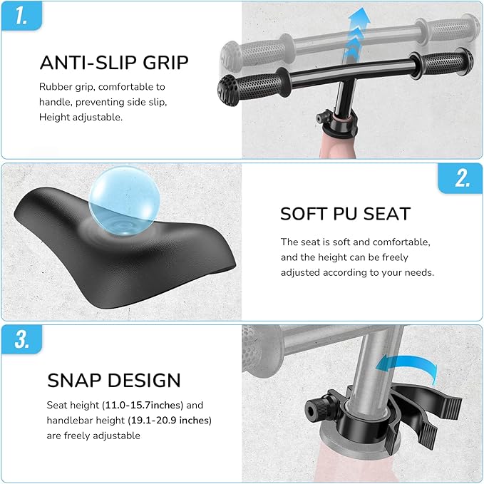 - GROW WITH TODDLERS - Equipped with the quick-release mechanism, the handlebar (19-20.9inch) and seat (11-15.7inch) of this balance bike can be adjusted to the most suitable height as the child grows (1.5-5 yrs). Until age 5, you don't need to buy a new bike.