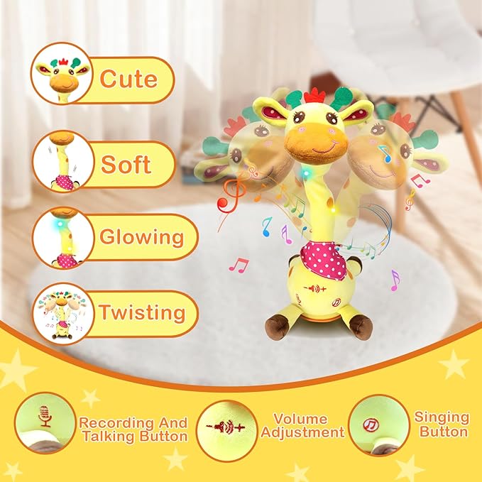- Dancing & Singing Giraffe Plush Toy: Interactive giraffe plush toy comes to life with cheerful songs and a wobbling dance, encouraging your infant or toddler to move and groove during tummy time or playtime.