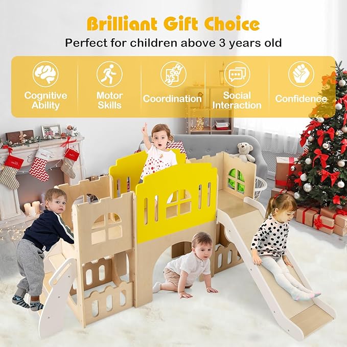 - Reliable Construction: This outdoor indoor playground boasts a wooden construction for durability and sturdiness. Complete by a splinter-free surface and rounded edges, toddler indoor playset creates a secure play environment for kids. The wooden jungle gym also complies with ASTM and CPSIA, adding to its reliability.