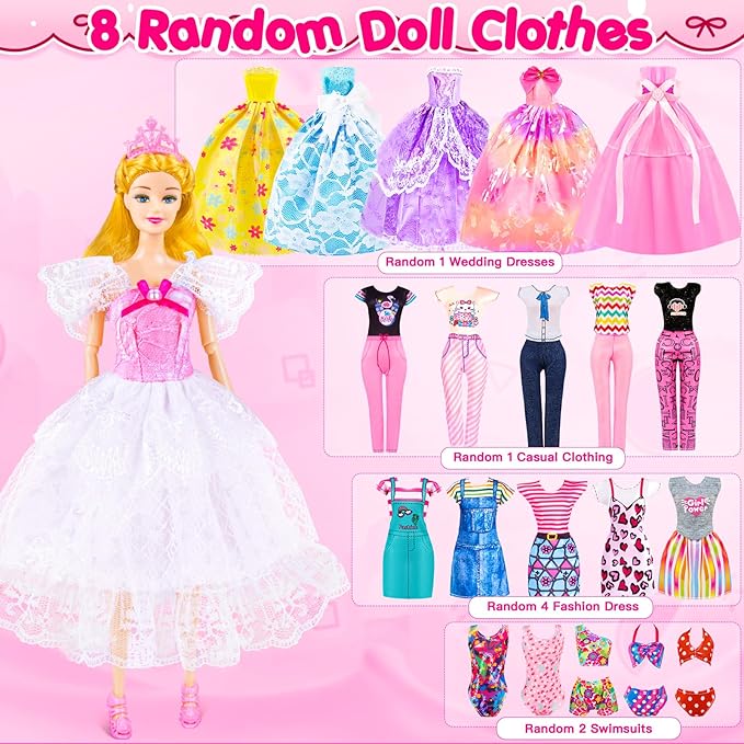 - 【Total 160+ PCS in Doll Closet & Caming Set】1 doll wardrobe, 1 doll (11.5inch), 1small doll with dress(5.1inch), Caming set(Tent, picnic blanket, etc ), Pet set, Beach swim accessories set, 1 random princess dress, 1 random casual clothing, 4 random fashion dresses, 2 swimsuit bikinis,10 clothes hangers, 30 transparent hangers,10 pairs of shoes, 60+ other accessories, etc. (Doll Clothes and accessories are random styles. Most shoes fit dolls with slanted feet. Dolls are included.)