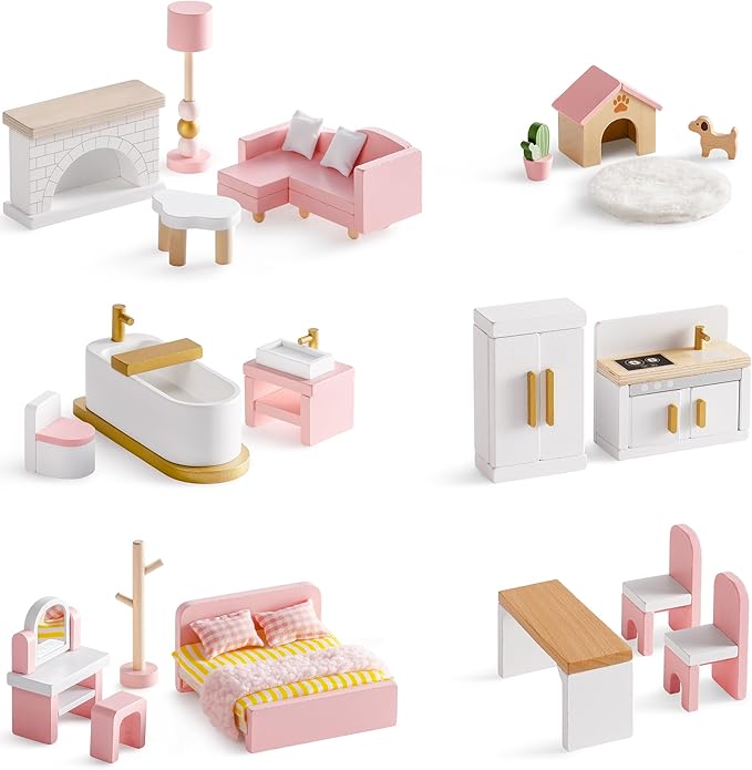 ROBOTIME Wooden Dollhouse Furniture Set, 28 PCS Miniature Dollhouse Furniture with 6 Room Kits, Dollhouse Accessories and Pretend Play Furniture, Gift for Boys and Girls Ages 3+