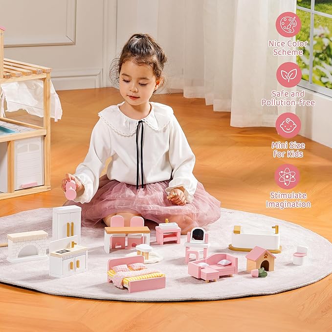 - Dollhouse Furniture Set: Transform any dollhouse into a cozy miniature home with this complete 28-piece wooden furniture set. Includes adorable pieces for the bedroom, kitchen, living room, and bathroom — perfect for endless decorating and storytelling fun.