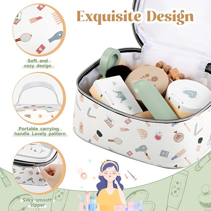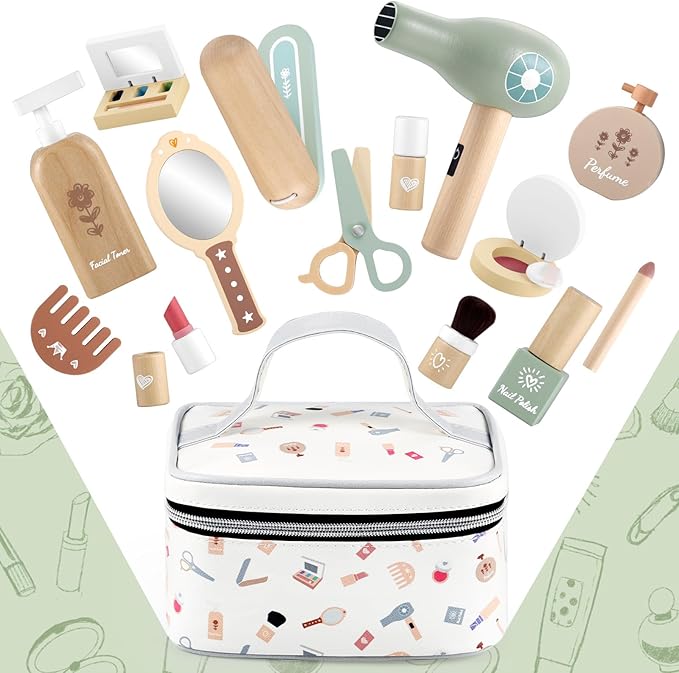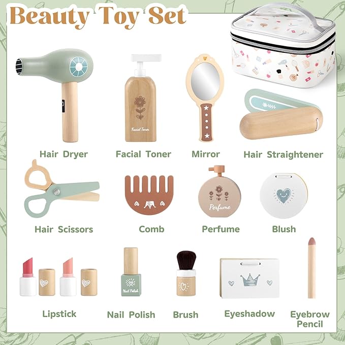 - 🎯 Realistic Wooden Makeup Set for Imaginative Play:Designed for toddlers aged 3-8, this wooden makeup toy set includes 18 realistic accessories like lipstick, perfume, eyeshadow, and a mirror. Encourages role-playing as little stylists, fostering creativity and social skills through pretend makeup play.