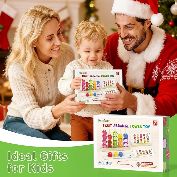 - 【Fun Bead Sequencing Games】 Start by choosing a card! Kids stack wooden blocks onto the stand following patterns or create new designs. This engaging sorting games builds problem-solving skills, color & shape recognition, logical thinking, creative thinking, and observation skills in toddlers. Our toddler bead kit includes 10 realistic fruits like watermelon, strawberry, blueberry, and orange – easy-to-play design sparks interest in toddler toys while teaching fruit vocabulary to 3-5 year olds.