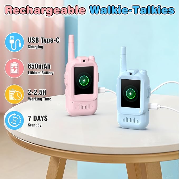 - 【Rechargeable & Long battery life】This kids walkie talkie features a built-in 650mAh rechargeable battery with Type-C fast charging, offering 3.5 hours of continuous use or 7 days of standby time after just a 1-hour charge. Simple one-button talk/video controls make it super easy even for young kids to use, whether indoors, on trips, or during outdoor adventures.