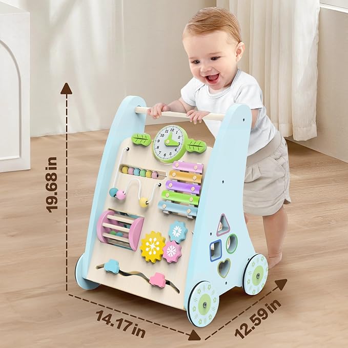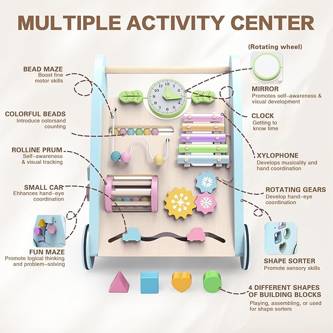 - Multi-Functional Push Walker:This is more than just a walker, it's your baby's early learning center! The Baby Push Walker comes equipped with eight activity toys, including a mirror, rolling drum, bead maze, xylophone, spinning gears, shape sorter, drum, and zig-zag track, providing a diverse range of play experiences for your baby.