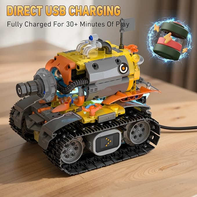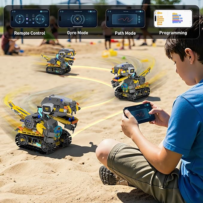 - 【Multiple Remote Control Modes】Robot building sets can be controlled to make any action through the remote control or the application. APP is designed with colorful icons, which is simple and clear. It contains driving mode, gravity mode, path mode, STEM programming mode, etc., which can be easily used even by programming novices. This robot building set uses a unique tracked chassis power output to make it easy to cope with various terrains, whether it is driving indoors or outdoors.