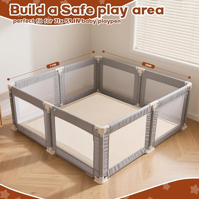 - MULTIPLE SCENARIOS - This baby play mat is suitable for 71×59 inch baby playpens and can seamlessly blend into any space, from the living room to the nursery. It is an excellent choice for children's birthdays, holidays, and baby GIFTS. Under the protection of the baby crawling mat, your child can boldly explore in a safe environment and develop their brain and body.