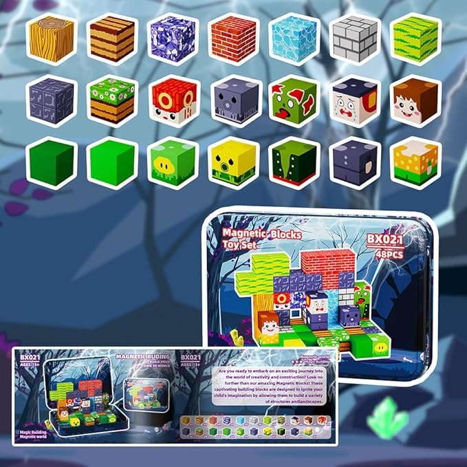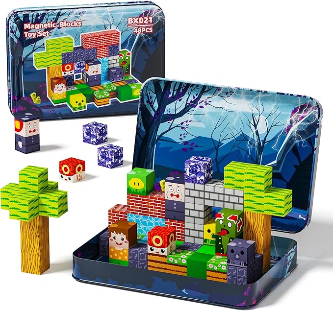 Magnetic Building Blocks, 48 Piece Set with Portable Iron Box, Kids Sensory Toys for STEM Learning, Children's Travel Magnetic Toys, Best Gifts for Boys and Girls' Birthdays and Christmas