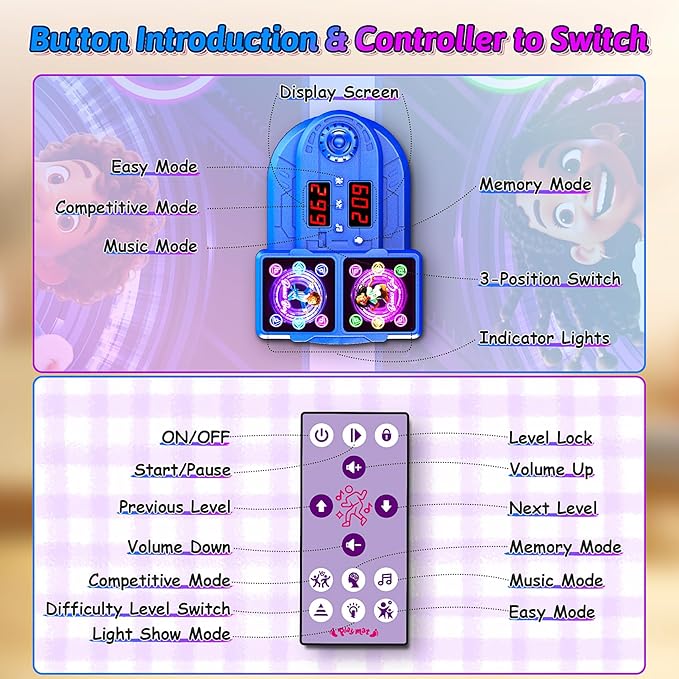 - 5 Fun Challenging Games: Easy / Memory / Music /Competitive/Light Show Function.Dance to the rhythm of built-in beats and scores in 5 different levels of interactive gameplay, with 6- and 12-button dance modes to satisfy your dance needs of all difficulty levels! Challenge to your memory game, and let you play the sound of drum instruments as a drummer. The dance game that girls can't put down.