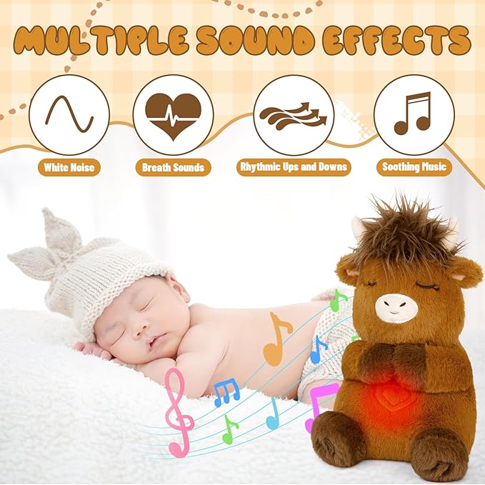 - MULTIPLE FUNCTIONS: Our breathing musical Highland cow plush features enchanting lights, soothing music , and a simulated breathing function. Creating a novel sensory experience that captivates children's interest, perfect gift for babies and kids.