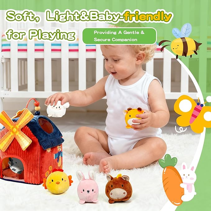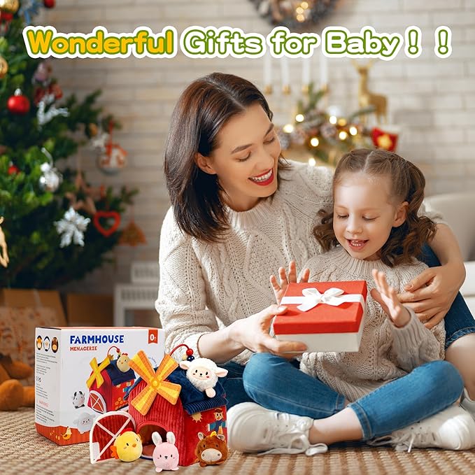 - Interactive Sensory Baby Toy– Big Surprise Barn and 6 Stuffed Farm animals with rattle, crinkle paper, squeaker and a peekaboo mirror. Engages hearing, touch and sight to spark curiosity and focus for your little one