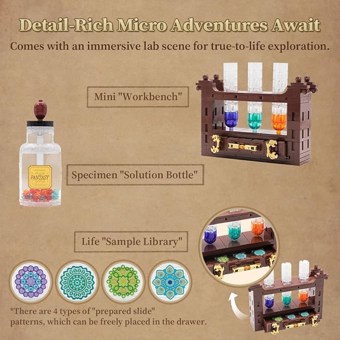- 【Complete Lab Accessories - Create a Miniature Laboratory】Includes 4 decorative slides with printed patterns, a slide storage box, a test tube rack with 3 colored reagent bottles, a removable dropper, and a specimen collection bottle. These detailed accessories enrich role-play and allow you to stage a realistic scientific research environment.