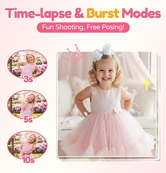 - 【HD Recording & Creative Shooting】:Equipped with an LCD screen, this toddler camera supports 1080P HD video and 26MP photo capture. It features 5x zoom, switchable front and rear lenses, and fun built-in modes like time-lapse and burst shot. With 33 creative filters and stickers, this camera for kids empowers them to effortlessly create unique photos and videos