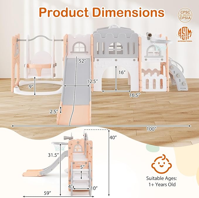 - Multi-Activity Playset: The toddler slide consists of the swing, slide, storage space, steering wheel, peek-a-boo window, aisle, crawling tunnel, telescope, climber, and basketball hoop. Coming with a basketball and inflator, the slide for kids is designed to engage your children for hours of fun.