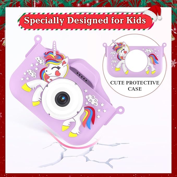 Kids Camera for 3-9 Year Old Boys Girls, Children Digital Camera with Cute Cartoon Soft Cover & 32GB SD Card, Best Christmas Birthday Gifts for Grandkids, Halloween Party Favors for Kids - Purple