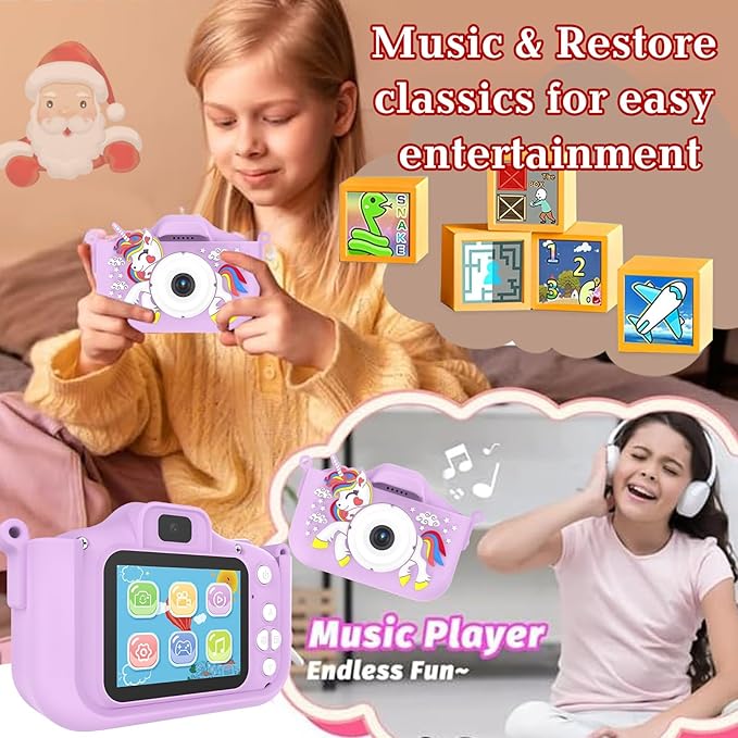 - 【Multiple Functions & Creative Play】Features include photo capture, video recording, playback (Download good music MP3 in advance), game play. Comes with 5 multi-puzzle games, such as classic snake man, maze game & sokoban. Built in 27 lovely picture frames, 6 filters and 10 mirror images. Use the built-in card reader or USB cable to download the photos to your computer, and then share your photos with your family and friends.