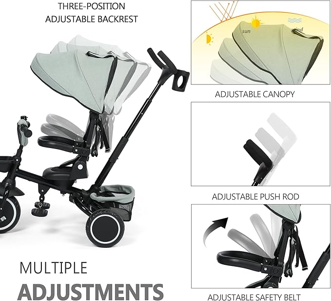 - Multiple Adjustment: Three position adjustable backrest for kids of different heights; Adjustable canopy; Three height push rod for easy parent operation; Detachable push rod allows children to ride independently; Recommended Age: 6 months+
