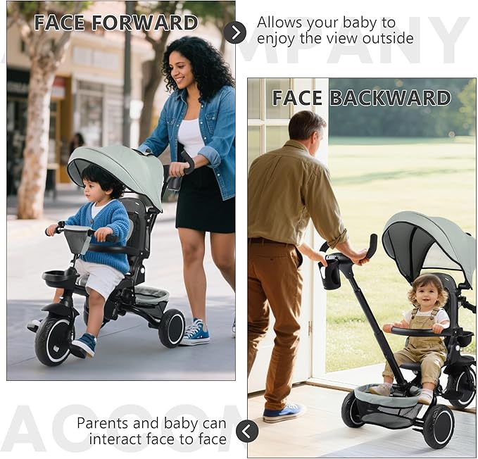 - 8 In 1 Tricycle: Accompany children at different stages; Multiple modes: push trike, toddler tricycle, steering tricycle, training trike or standard trike and so on; Reversible seat allow toddlers to enjoy the view or interact with their parents