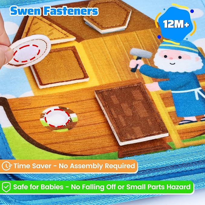 - SEWN FASTEN - SAFE & NO NEED ASSEMBLY - We know safety come first. Meet Esjay busy board which is made of non-toxic, child-safe fabric with securely sewn components, sturdy to withstand toddler use. With no loose or small parts that can come off, it ensures worry-free independent play for 1 2 3 year old babies and toddlers. Fully pre-assembled and ready for instant fun right out of the box, this busy book saves you time and brings peace of mind.