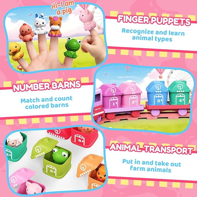 - Farm Animal Role Play Game: Inspire imagination and enjoy fun role-play! Includes 8 adorable animal figures that double as finger puppets. The pink train features a detachable roof, allowing children to place figures inside for interactive fun. Kids use finger puppets for pretend play, while parents join in for laughter-filled fun. Enhancing animal recognition and language skills and creating sweet moments of connection