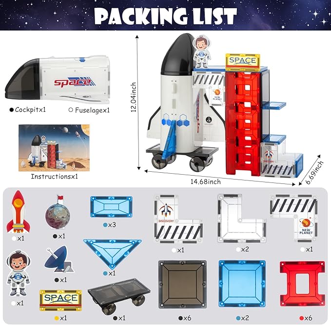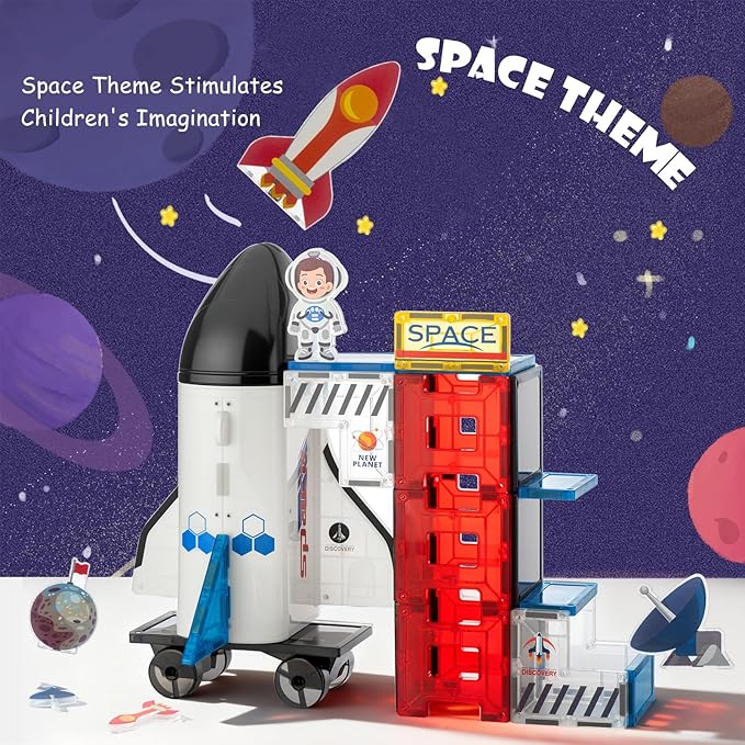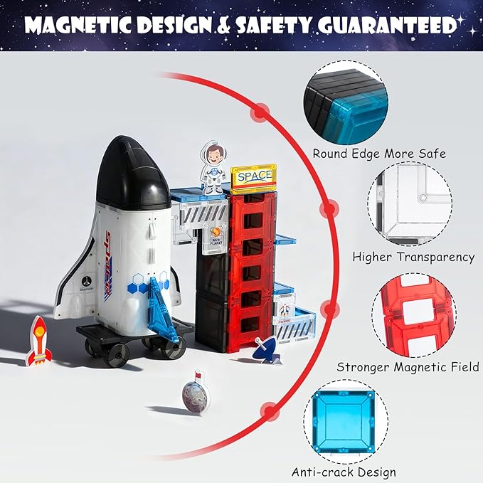 - SPACE THEME: Magnetic building set featuring a rocket ship design with transparent panels, movable parts, and space-themed accessories for imaginative play