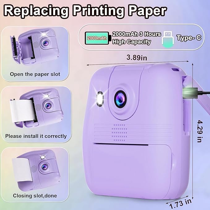 - High-Capacity Battery & Reliable Support: The thermal camera kids is powered by a 2000mAh rechargeable battery and a Type-C USB charging port. Once fully charged, it lasts 3-4 hours of fun. The camera comes with a lanyard, making it easy for children aged 3-12 to carry and preventing loss. With a 24-month warranty and dedicated customer support, this multifunctional kids instant print camera is designed for durability and peace of mind.