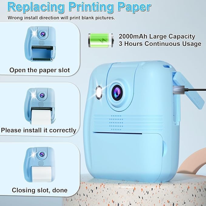 - High-Capacity Battery & Reliable Support: The thermal camera kids is powered by a 2000mAh rechargeable battery and a Type-C USB charging port. Once fully charged, it lasts 3-4 hours of fun. The camera comes with a lanyard, making it easy for children aged 3-12 to carry and preventing loss. With a 24-month warranty and dedicated customer support, this multifunctional kids instant print camera is designed for durability and peace of mind.