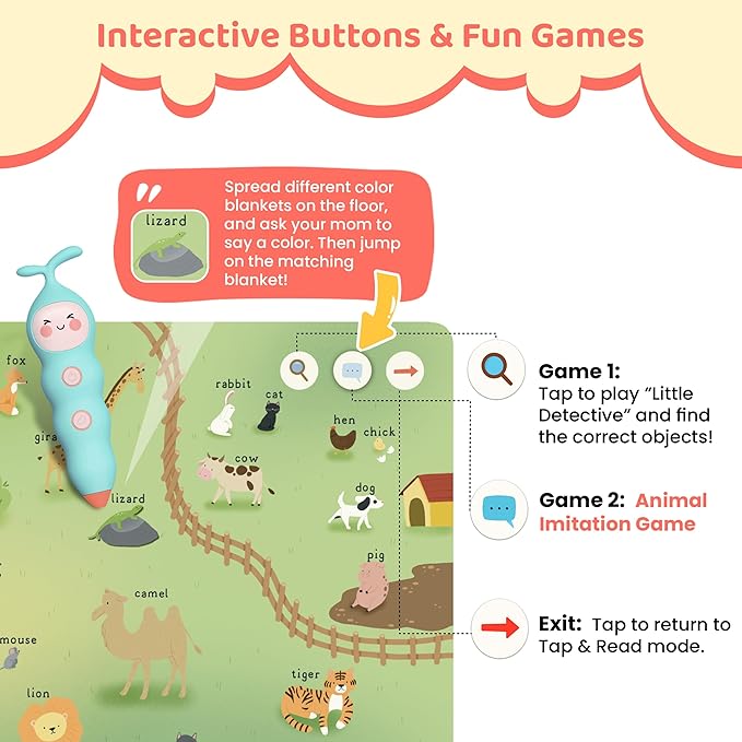 - ♥︎ 2 General Knowledge Sound Books ♥︎ - These 2 books cover 24 themes, from the Alphabet and Numbers to Animals and the US Map, with over 600 illustrated words and fun facts. They also include 700+ interactive questions across game modes like role-playing, detective, and peek-a-boo. The experience is enriched by 26 background songs and immediate sound effects for all answers.
