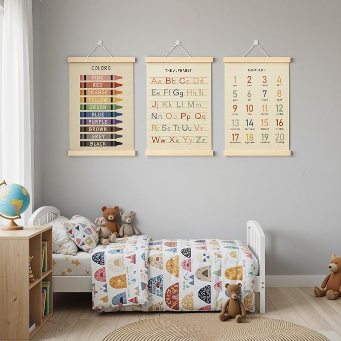 - Instant Educational Gallery: This toddler learning posters 3-piece set transforms playrooms, nurseries & classrooms into learning galleries. Premium wooden frames with refined edges deliver gallery-style displays. Use included hooks for wall hanging or lean on shelves – switch layouts in seconds