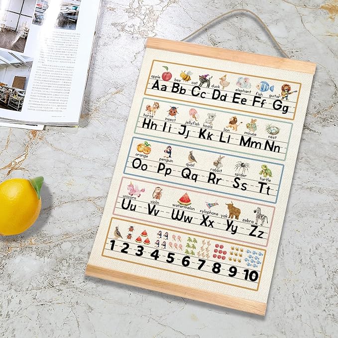 HEYJEEPER Kids Alphabet and Numbers Learning Posters,18.5x14 Inch Linen&Canvas Educational Wall Art with Wood Hanger, ABC 1-10 Chart for Toddlers Classroom Nursery Playroom Decor(Colorful-03)