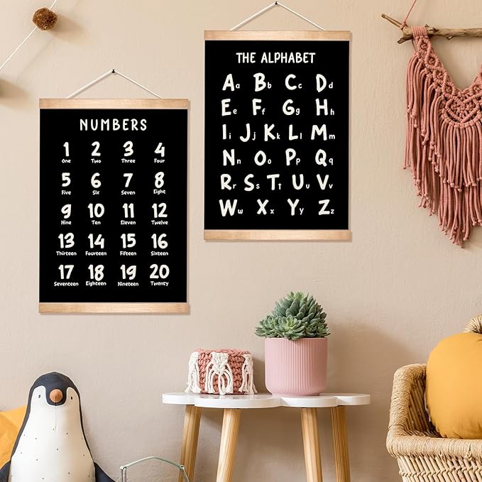 HEYJEEPER Kids Alphabet and Numbers Learning Posters Set of 2,18.5x14 Inch Linen&Canvas Educational Wall Art with Wood Hanger, ABC 123 Chart for Toddlers Classroom Nursery Playroom Decor(Black)