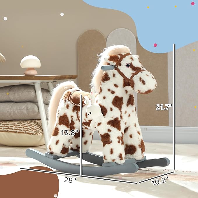 Qaba Rocking Horse, Kids Plush Animal Rocker with Realistic Neighing Sound for Toddlers 2–5 Years Old, Soft Filling Ride on Horse with Rabbit Toy, Brown
