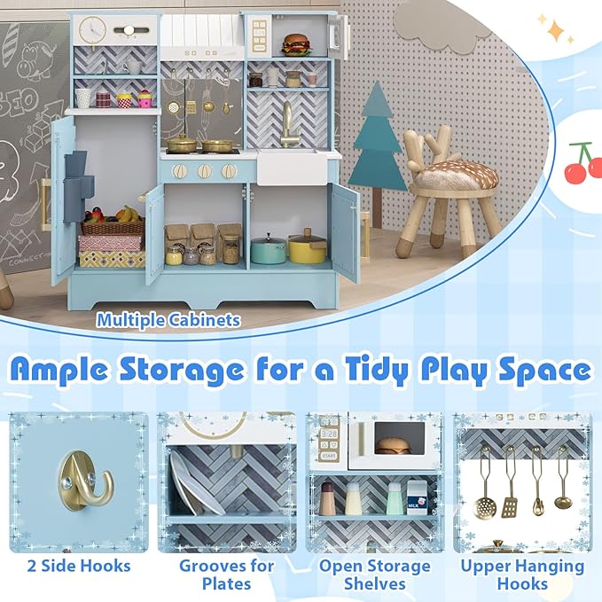 - Spacious Storage Space: Keep the kitchen tidy after every feast with generous storage including multiple cabinets, handy hanging hooks, special grooves for plates, and convenient storage shelves, providing ample space for children's daily toys, snacks, books, cups, and other items. The kids play kitchen set encourages organizational skills and responsibility.