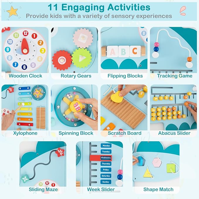 - Multiple Gameplay Options: This 11-in-1 wall busy board includes a wooden clock, rotary gears, flipping blocks, a xylophone, a spinning block, a scratch board, a tracking game, an abacus slider, a week slider, a sliding maze and a shape match game, providing a variety of sensory experiences for endless fun.