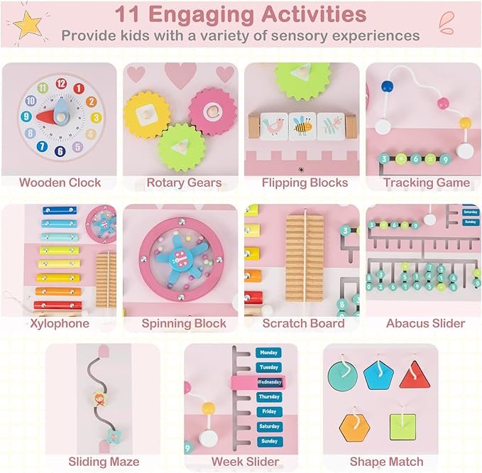 - 11 Engaging Activities: Packed with entertainment, this wall busy board includes elements like an abacus slider, xylophone, shape match, wooden clock, rotary gears, flipping blocks, sliding maze, scratch board, spinning block, week slider, and tracking game—offering a truly dynamic sensory board experience for every curious child.